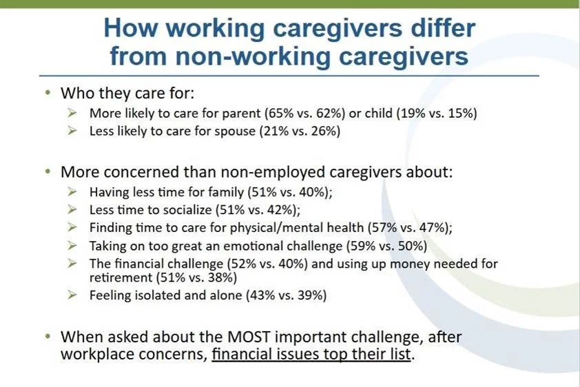 Eileen explained that survey data from 4,500 working caregivers reflected that they are more likely than caregivers not in the workforce to care for a parent or child than a spouse and that these caregiving responsibilities often disrupt their work lives—ultimately impacting their ability to perform their jobs effectively. In addition, research reveals that working caregivers express more concern about their long-term financial security compared to non-working caregivers, who must decide between saving for retirement or caregiving costs.
